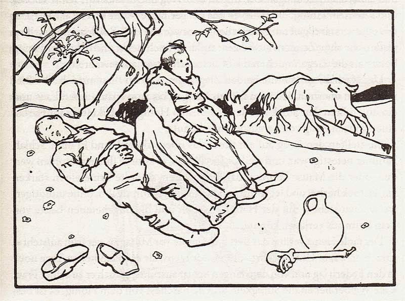 Hein was lui. En ofschoon hij niets anders te doen had, dan elke dag de geit naar de wei te brengen, zuchtte hij toch nog diep, als hij na zijn volbrachte dagtaak ’s avonds thuiskwam. “Het is stellig een zware taak,” zei hij, “een moeitevolle arbeid, zo’n geit jaar in jaar uit tot diep in de herfst te hoeden. En als je dan tenminste nog eens kon gaan liggen en een tukje doen! Maar nee. Overal moet je ogen hebben, anders knabbelt hij aan de jonge boompjes, of hij loopt door een hek een tuin binnen, of hij probeert weg te lopen. Hoe kun je dan nog een ogenblik rust hebben of plezier hebben in je leven!” Hij ging zitten, liet zijn gedachten gaan, en overlegde hoe hij die zware last van zijn schouders kon wentelen. Lang was z’n nadenken vergeefs, maar opeens vielen hem de schellen van de ogen. “Ik weet het al!” riep hij uit, “ik trouw met dikke Trien, die heeft ook een geit, en dan kan ze de mijne erbij hoeden, dan heb ik er geen last meer van.” Dus stond Hein op, zette z’n vermoeide leden in beweging, ging dwars de straat over, want verder was het niet, -waar de ouders van dikke Trien woonden, en vroeg de hand van hun ijverige en deugdzame dochter. De ouders hoefden er niet lang over te denken. “Soort zoekt soort,” meenden ze en gaven hun toestemming. Zo werd dikke Trien de vrouw van Hein, en ze hoedde beide geiten. Hein beleefde goede dagen; hij hoefde nergens meer van bij te komen dan van z’n eigen luiheid. Alleen ging hij nu en dan mee naar buiten en zei: “Dat doe ik alleen om later meer van mijn rust te genieten, anders zou je ’t gevoel ervoor nog verliezen.”